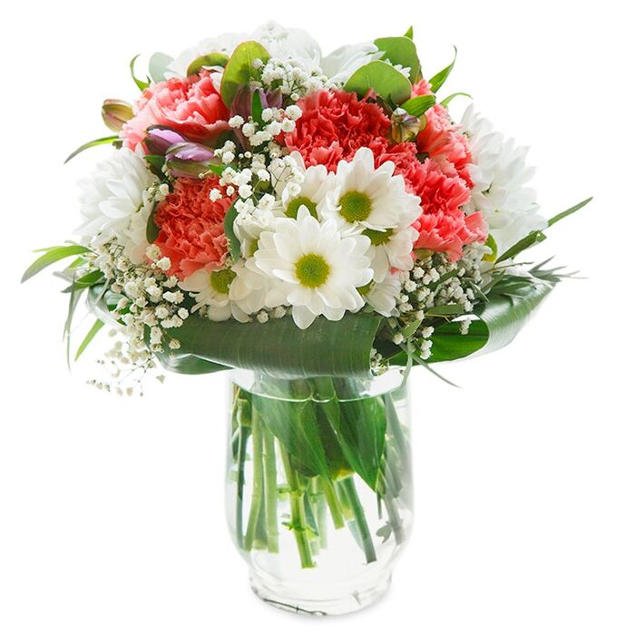 Joy radiates from this vibrant bouquet, gathered with a local Blackheath touch and presented in a crisp white carrier bag. The star here is a harmonious mingling of coral, pink, and ruby red carnations, their lavish, layered petals promising both exuberance and a whisper of sweet scent. Bright white daisies peer out from the folds, their cheerful golden-green hearts offering a smile as warm as a Saturday morning at the Blackheath Farmers' Market. Cloudlike sprigs of airy Gypsophila are scattered throughout, softening the bouquet and adding innocence-recalling the tranquil atmosphere found wandering through Greenwich Park nearby. Deep green, glossy foliage envelops the base, its wide leaves an anchor of elegance and vitality. Subtle hints of lavender-tinged buds nestle on one side, poised to blossom anew and lend a quiet intrigue to the rounded form. Everything is arranged with exceptional care in a sturdy white bag with simple ribbon handles, making it as suitable for easy delivery to Shooters Hill Road as it is for a heartfelt handoff at the door. The entire arrangement glows with morning light and freshness, the colours and textures captured with professional finesse. This bouquet is a celebration in itself-ideal for birthdays, moments of gratitude, or simply adding a spark of Blackheath's lively community spirit to any day. Evoking the sunlit pastures and peaceful gardens of Blackheath, this bouquet is a masterclass in floral harmony and gentle radiance. Pure white daisies, each anchoring a lime-green center, are circled by coral-pink carnations whose billowing, ruffled petals create joyous movement and soft texture. Cloud-like clusters of baby's breath float through the bouquet, giving it a weightless and dreamy quality, while elegant eucalyptus leaves and dark green sprigs add grounding coolness and subtle contrast. Peering between the main blooms, youthful alstroemeria buds tinged with purple and blush pink hint at the romance of future growth. The arrangement's circular fullness, expertly achieved by Blackheath Flowers' skilled florists, embodies both celebration and tranquillity-an uplifting token for birthdays, anniversaries, or everyday thanks. The bouquet's vivacity reflects Blackheath's community spirit and is perfect for brightening homes around Cresswell Park, Vanbrugh Park, or those peaceful corners near the heath itself-each petal telling a story of care, artistry, and local pride. Bathed in soft, natural light, this cheerful arrangement brings the beauty of Blackheath's leafy landscape indoors. Lively coral-pink carnations, boasting playful, rippling petals, form the dynamic core, radiating warmth and positivity. Surrounding them, crisp white daisies and lush chrysanthemums open in perfect unison, their bright green and golden centers glistening like morning sunshine over Greenwich Park. Wisps of baby's breath wind gently throughout, adding cloud-like softness that lightens the bouquet's silhouette and evokes a sense of calm. Magenta alstroemeria buds rest quietly along the edge, hinting at the story still unfolding for this arrangement. A base of glossy dark green leaves envelops the bouquet like a gentle hug, while slender accents of foliage add to the organic, handpicked spirit found on Blackheath's local high streets. Resting in a clear glass vase with water visible beneath, the bouquet's sturdy stems showcase natural freshness, perfect for same-day delivery around Blackheath Village and the surrounding area. This arrangement is designed to uplift-whether for birthdays, new beginnings, or thoughtful 'just because' gestures, its joyful palette and blackheath flair make every corner feel just a bit brighter.